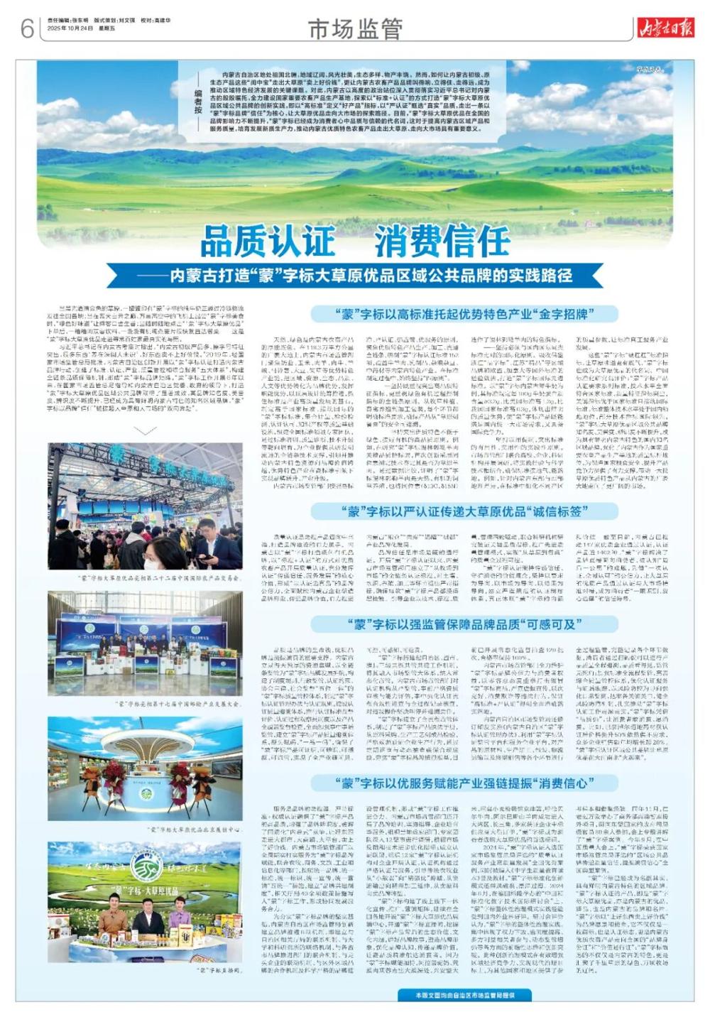 内蒙古日报整版推介:品质认证 消费信任——内蒙古打造“蒙”字标大草原优品区域公共品牌的实践路径